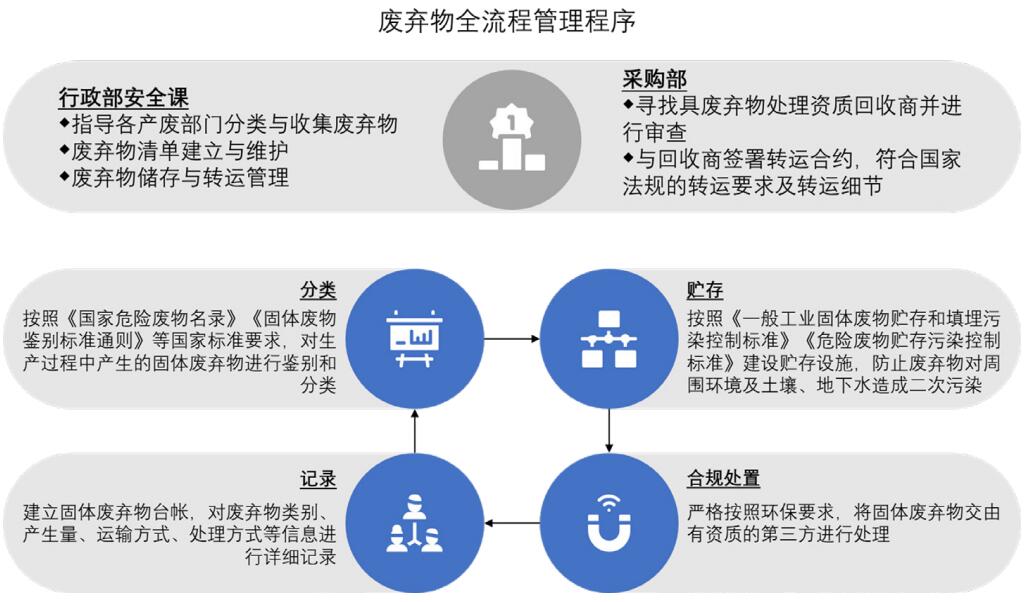 本集團(tuán)嚴(yán)格遵守《中華人民共和國(guó)環(huán)境保護(hù)法》《中華人民共和國(guó)固體廢物污染環(huán)境防治法》等法律法規(guī),制定《廢棄物管理程序》,明確“分類回收、集中保管、統(tǒng)一處理”的廢棄物管理原則,對(duì)固體廢棄物進(jìn)行分類、貯存、合規(guī)處置及記錄的全流程管控,以盡可能降低廢棄物對(duì)周圍環(huán)境的影響。